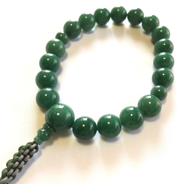 印度翡翠(アベンチュリン)で仕立て上げたお念珠です。 緑色が優しく発色されており、幅広い年代の方にご利用いただけます。 こちらは、略式念珠(片手念珠)のためどの宗派の方にもお使いいただけます。 天然石のため若干の色斑、気泡あり 親玉 11mm 主玉 8mm 二点玉 5mm